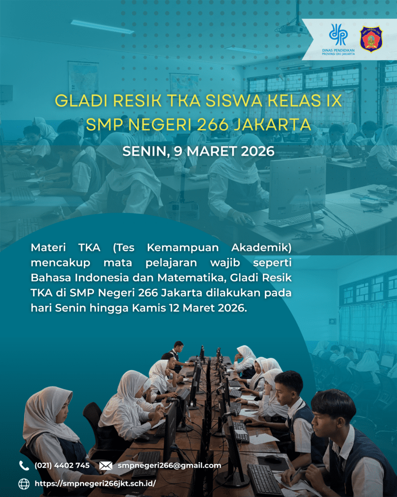 JAKARTA – Menjelang pelaksanaan Tes Kemampuan Akademik (TKA), SMP Negeri 266 Jakarta menyelenggarakan kegiatan Gladi Resik TKA bagi seluruh siswa kelas IX pada hari ini, Senin, 9 Maret 2026.